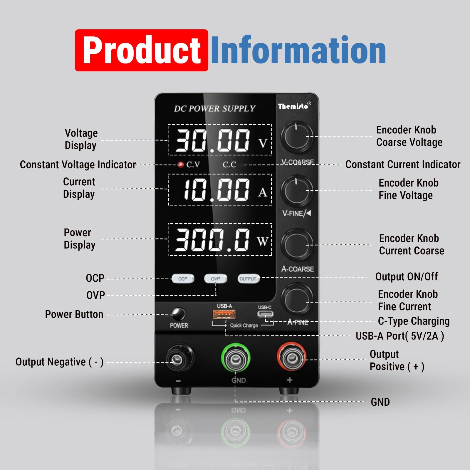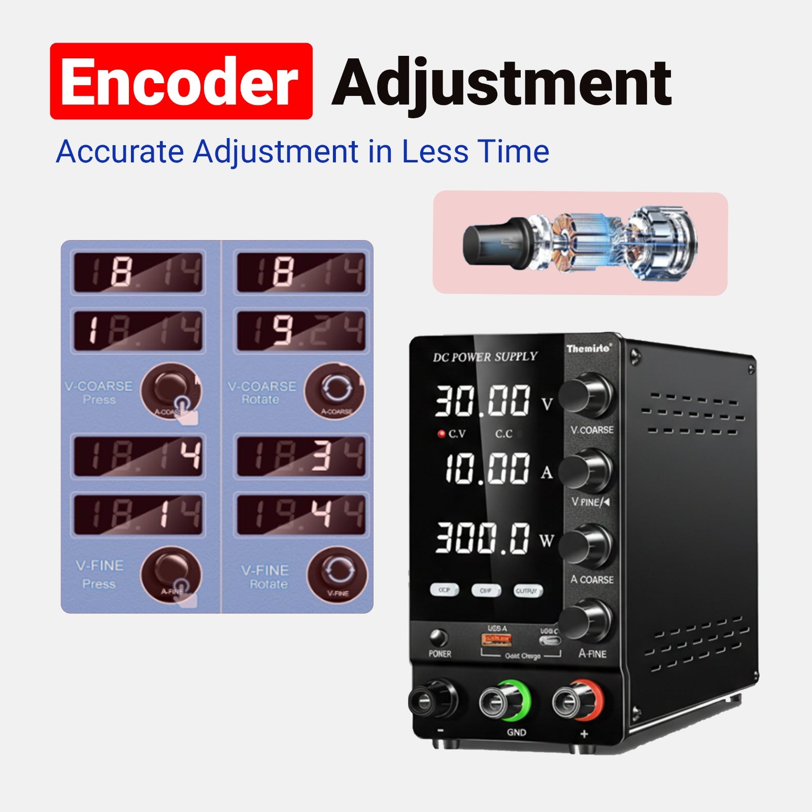 Themisto TH-SPS3010S Adjustable DC Bench Power Supply 0–30V 0–10A, Regulated Switching Power Source with 5V/2A USB Output, 300W High Precision Lab Power Unit