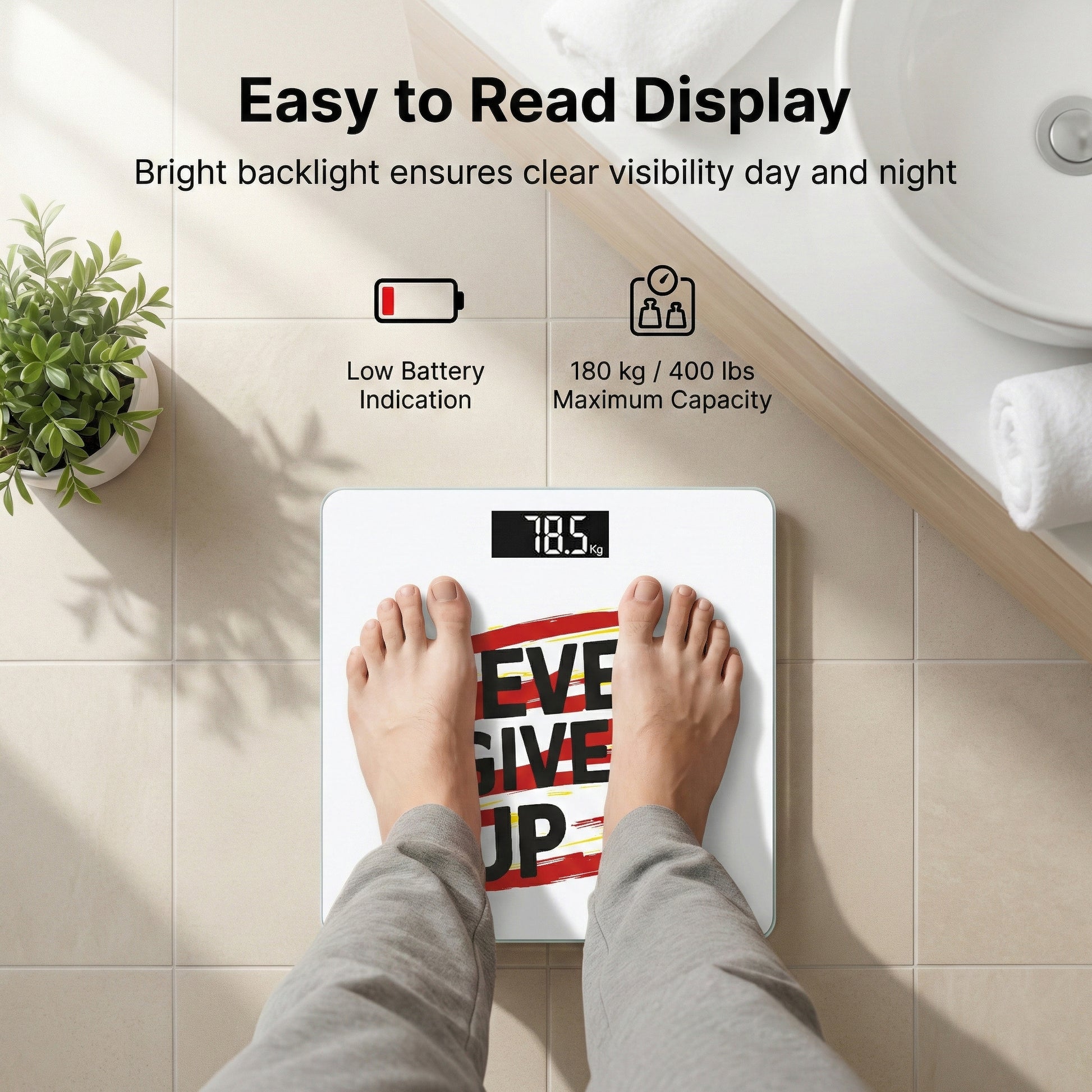 - Ensure the scale is placed on a flat surface, free from obstruction.